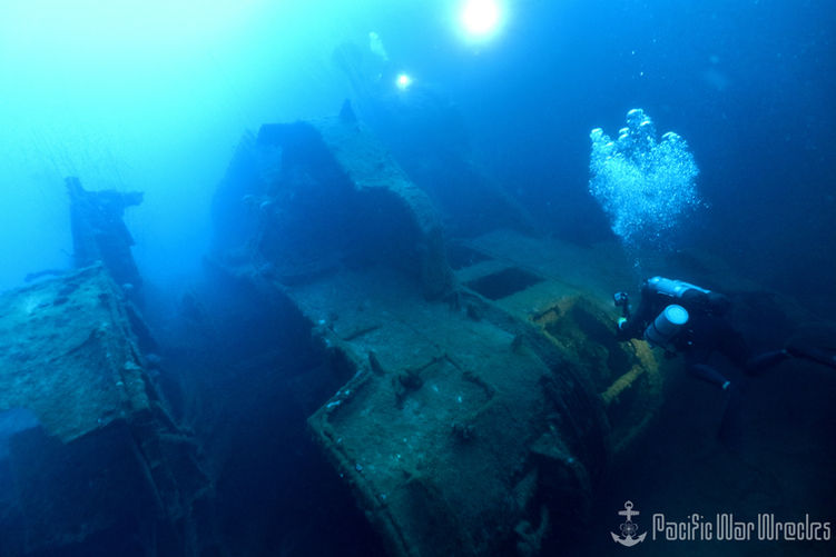 言わずと知れた連合艦隊旗艦を最も長く勤めた日本海軍の象徴。長門方戦艦の一番艦。終戦時航行可能な唯一の戦艦だった。 戦後アメリカ軍に接収され、アメリカ軍の核実験の標的艦としてビキニ環礁で沈んだ。 ビキニ環礁内の52-3mの海底に、ほぼ上下逆さまに沈んでいるが右舷側がより沈み込んでおり、 艦橋などは進行方向に向かって右手に倒れている。副砲はアメリカ軍の武装解除により全て取り払われていると思われるが 4基ある主砲はすべて今なお艦体についた状態で残存している。 水面に一番近い上下逆さまになった船底でも30m弱あるので実質テクニカルダイビングでのアプローチしか無いと考えられる。
